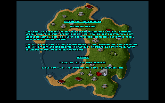 For its era, Red Ghost’s isometric maps exhibit impressive detail: tree-lined ridges, bunkers camouflaged in sand, and sprawling industrial complexes rendered in crisp, flat-shaded polygons. Enemy units and environmental hazards stand out clearly against the terrain, ensuring that tactical decisions are never obscured by visual clutter. Zooming in slightly on the overhead view reveals sprite-based soldiers moving with surprisingly smooth animations.