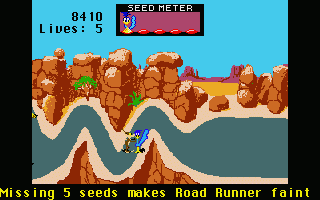 Adding to the tension is the ever-present threat of Wile E. Coyote, who prowls just off-screen before bouncing into view in hot pursuit. If you hesitate or fail to react to an obstacle, you’ll find yourself in Coyote’s clutches and the chase ends in a cartoonish “thud.” To keep that from happening, you must gobble up birdseed scattered along the roadside; neglect it and you’ll grow faint, making escape impossible.
