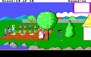 For a title originally released in the mid-1980s, Mixed-Up Mother Goose boasts charming, hand-drawn 2D pixel art that still holds up today. The color palette is bright and cheerful—fields of green, sky-blue backgrounds, and vividly colored characters bring each nursery rhyme setting to life. Whether you’re wandering through a field of dewy daisies or inside Mother Goose’s cozy cottage, the visuals evoke a storybook feel.