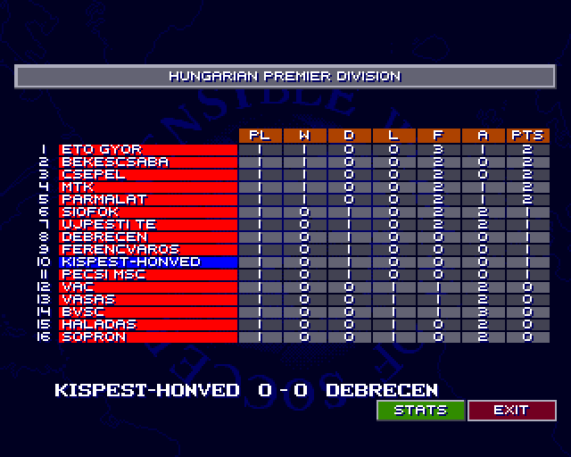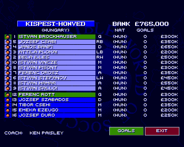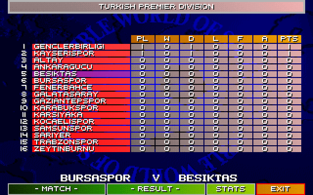 The DOS build, based on Amiga version 1.1 with the 1995/1996 season data, benefits from enhanced on-pitch skill animations. Players move fluidly, dribble with flair, and celebrate goals with distinctive gestures that add personality to each squad. Stadium backdrops and crowd sprites are minimal but effectively convey the atmosphere, and subtle touches—like changing kit colors and pitch markings—help immerse you in the global football scene.