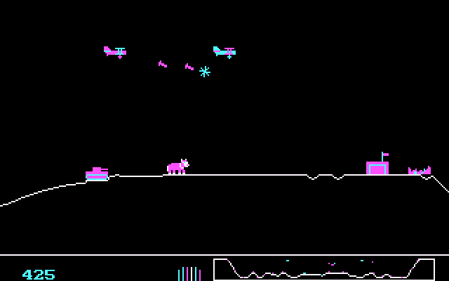 Visually, Sopwith: The Author’s Edition opts for a clean, retro aesthetic that harks back to early DOS titles. While there’s no high-definition texture work or polygonal models here, the crisp line art and bright color palette convey important game-state information with clarity. Enemy planes appear in contrasting hues, buildings are easily distinguishable targets, and explosions briefly flood the screen with vivid pixel bursts that feel satisfying rather than distracting.