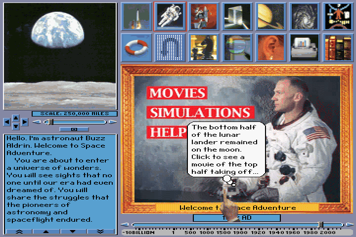 Visually, Space Adventure leverages an impressive archive of video and photographic material to bring outer space to life. High-resolution footage of Apollo launches and Voyager flybys plays seamlessly within the game, offering moments of genuine cinematic impact. These clips are complemented by crisp, well-captioned images of eclipses, rockets, and hypothetical space colonies, creating an immersive multimedia tapestry.