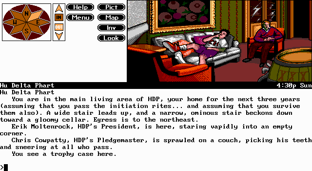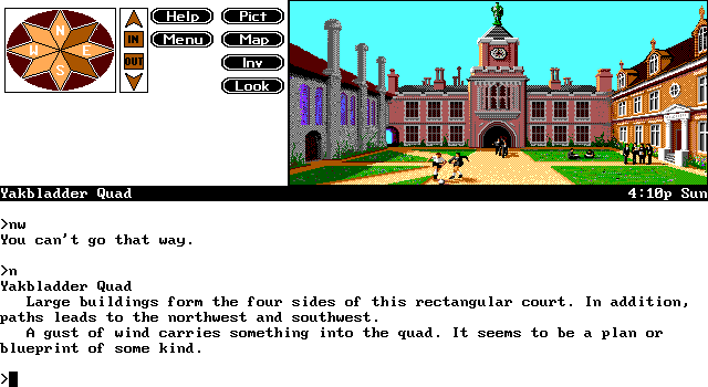 The user interface strikes a clean, functional balance. A central text window narrates each scene, while a sidebar lists spells, objects, and actions. Color highlighting draws your eye to interactive elements, and a simple compass rose at the bottom helps you keep your bearings on campus. Though it may look dated by today’s standards, this streamlined layout keeps the focus squarely on story and puzzle-solving without visual clutter.