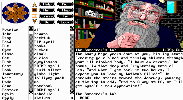 Spellcasting 201: The Sorcerer’s Appliance continues the series’ tradition of interactive fiction, turning text commands into a fully realized magical campus adventure. The left side of the screen displays your roster of spells and inventory items, allowing you to click on a spell or object and then click on the target in the main text window. Movement is handled via the eight compass directions, making navigation through Sorcerer University’s sprawling grounds intuitive once you get the hang of it.