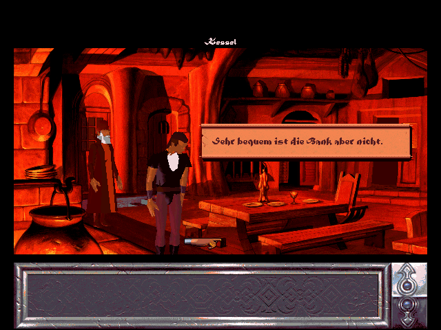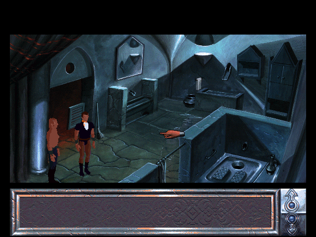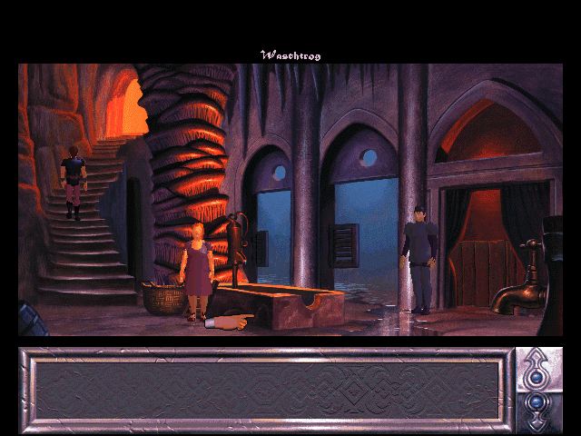 Ten years later, you resume control of Alex as a young man determined to master the talisman’s power and confront the demonic horde. Dialogue sequences, triggered by clicking on characters, present you with a list of questions that replace the inventory bar. These branching conversations gradually flesh out Thurania’s history, the nature of the talisman, and the secrets of the Golans’ underground lair.