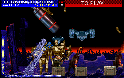 For an early ’90s arcade title, Terminator 2’s visuals remain impressive. The backgrounds are richly detailed, from the burning wastelands of Judgment Day’s aftermath to the sterile corridors of Cyberdyne Systems. Each level’s set pieces—overturned vehicles, flickering monitors, collapsing walls—react dynamically to your firepower, lending a cinematic flair to every encounter.