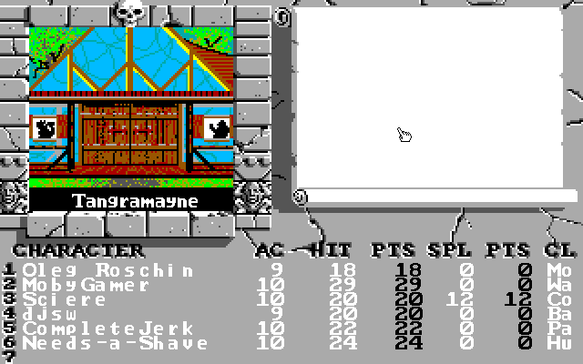 The character portraits in combat screens are detailed, with each party member’s sprite animated to show readiness or injury. Enemy sprites range from simple goblin faces to more elaborate undead lords, giving each encounter visual identity. Town maps and menus are cleanly designed, ensuring that inventory management and spell selection remain straightforward, even on older hardware.