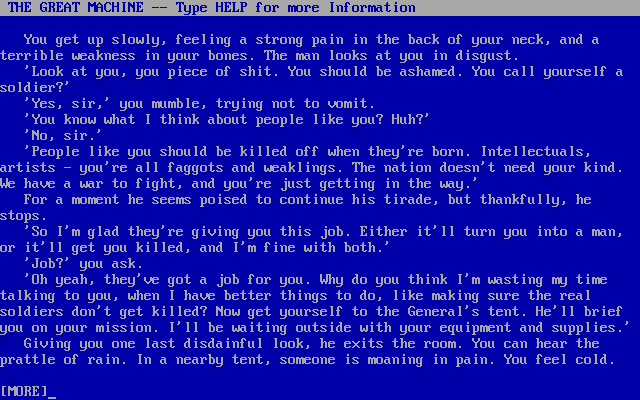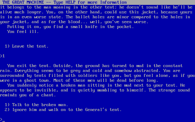 The Great Machine employs a classic Choose-Your-Own-Adventure framework, trading fast-paced action for a contemplative, text-driven experience. Players navigate a series of decisions—each choice a small gear in the vast engine of conflict—guiding a lowly soldier through harrowing battlefields and morally fraught operations. Rather than thrusting you into explosive firefights, the game challenges your conscience: do you follow orders to assassinate “Los,” or do you question the machinery of war itself?