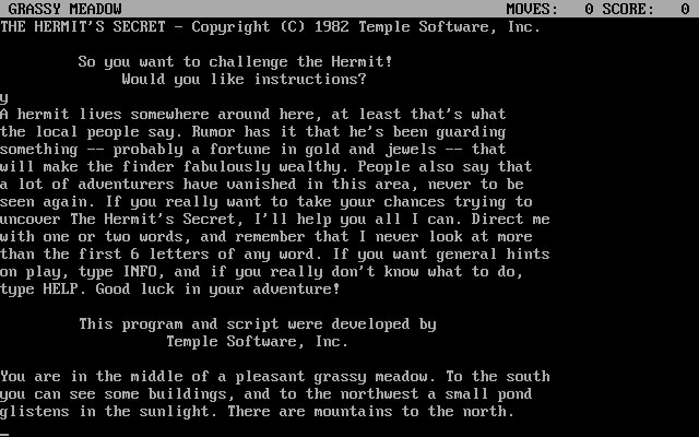 Ultimately, The Hermit’s Secret may not revolutionize interactive fiction, but it refines the essentials into a smooth, enjoyable package. Temple Software has once again delivered a tidy, well-paced adventure that reminds us why text adventures captured imaginations in the first place. If you appreciate clear writing, clever item-based puzzles, and the satisfaction of uncovering hidden treasures through ingenuity, this modest release is well worth your time.