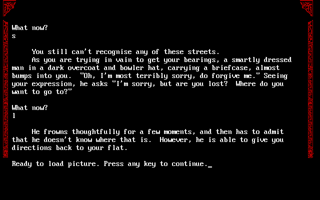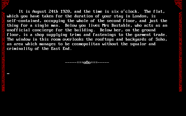 Despite the lack of visual assets, the interface is clean and functional. Text is displayed in a clear monospaced font with occasional underlining or capitalization to indicate interactive objects. Some versions of the game include sparse ASCII‐style maps to help you track your progress through London’s winding alleys or the hidden stacks of the British Library, which helps orient you in the absence of graphical representations.