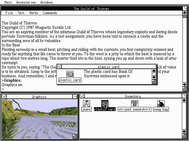 Each title benefits from a unified interface that brings inventory panels, text history, and dynamic maps into a single windowed layout. You can play fullscreen or re-size individual panes to suit your preference, instantly switching between text, illustrations, and navigational aids. These convenience features minimize guesswork, letting you focus on clever puzzle mechanics—such as the molecular contraptions in Fish! or the heist planning in The Guild of Thieves—rather than on fiddly command inputs.