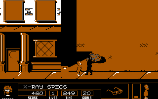 Visually, Bart vs. the Space Mutants captures the vibrant, cartoonish look of The Simpsons while working within the technical limits of 8- and 16-bit hardware. Character sprites are instantly recognizable—Bart’s spiky hair, Homer’s protruding belly, and Moe’s scowling face all translate well to the pixel grid. The backgrounds feature familiar Springfield locales like the Kwik-E-Mart, the nuclear power plant, and Springfield Elementary, each rendered with bright colors and simple details.