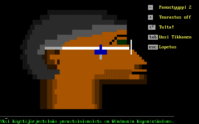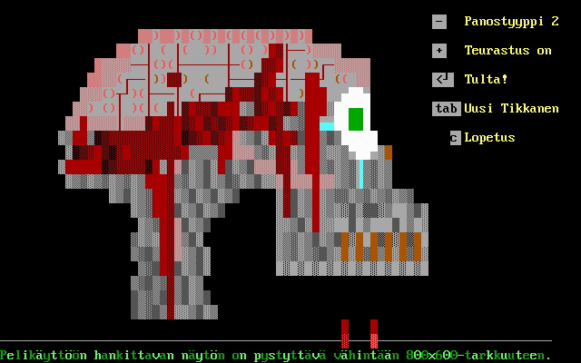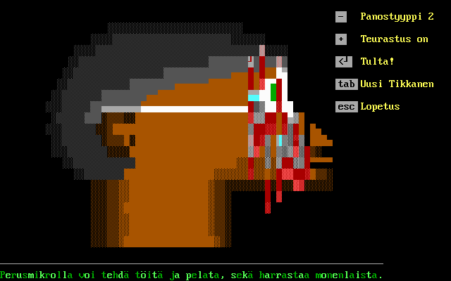 Graphically, Tikkasentappopeli leans into an ANSI art style that emanates retro-charm and raw brutalism. The target’s silhouette begins as a flat, monochrome outline but transforms dramatically with each impact, painting a chaotic portrait of simulated violence in stark red and black tones. This aesthetic choice not only pays homage to early terminal games but also complements the game’s no-frills, shock-driven ethos.