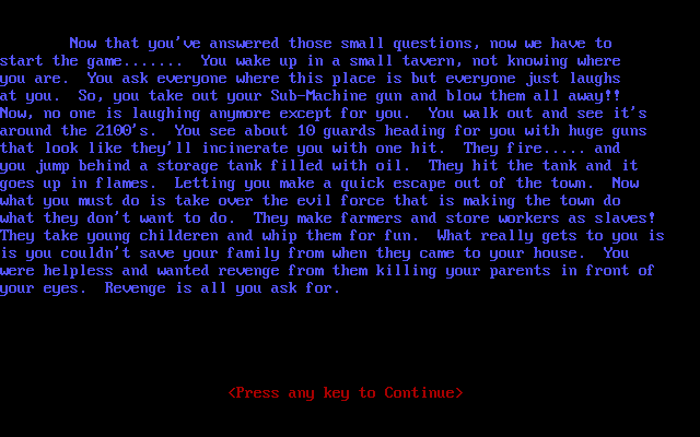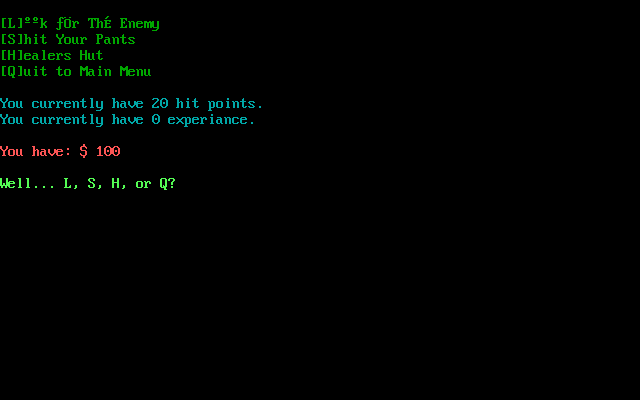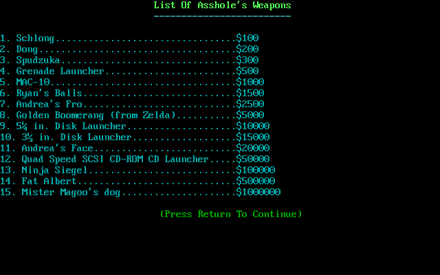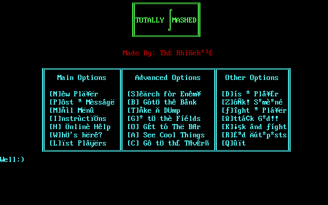 Don’t expect high-definition textures or 3D vistas in Totally Smashed—this is a BBS door game through and through, offering purely ASCII art and text. The entire town, its deranged inhabitants, and your slew of makeshift weapons are rendered in blocky characters. This retro aesthetic won’t appeal to everyone, but it has a nostalgic charm for those who recall logging into bulletin board systems in the 1980s and ’90s.