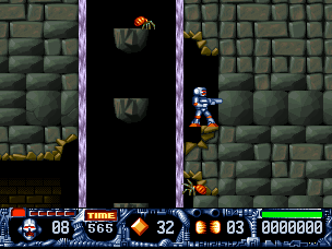 Character and enemy sprites remain clear and expressive even amid the most hectic firefights. Explosions burst with vivid frames of animation, and the Turrican suit’s transformations are accompanied by smooth shape-shifting visuals. The bosses, in particular, benefit from large, multi-part designs that showcase the developers’ skill at sprite layering and clever use of the limited color palette.