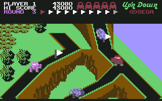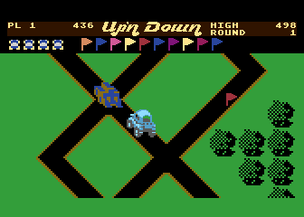For a game of its era, Up ’n Down’s graphics are charming and colorful, with a clean, isometric perspective that gives the courses an almost three-dimensional feel. Tracks twist and turn against a backdrop of bright green grass and tan dirt roads, making it easy to spot ramps, obstacles, and enemies. The visual clarity ensures you won’t mistake a safe path for a trap or a ramp for a dead end.