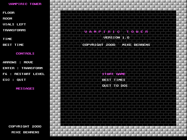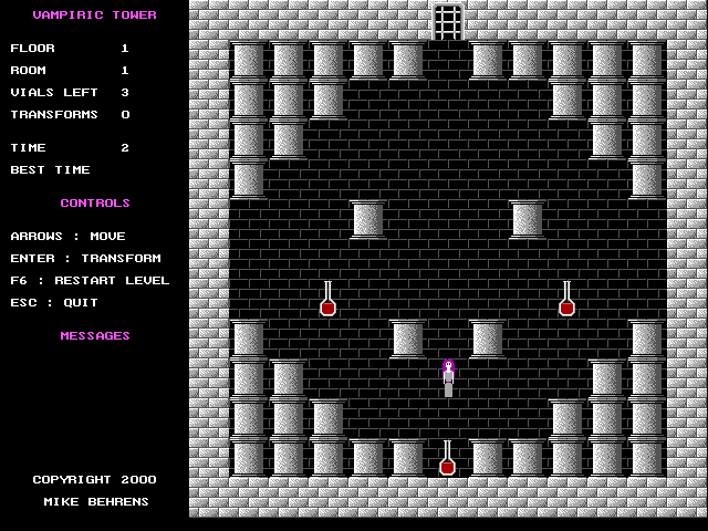 Vampiric Tower delivers a tight and addictive puzzle-platformer experience by placing the player in control of a comely purple-haired vampire on a quest to collect fifty vials of blood, ten per level. Each room presents a self-contained challenge: you cannot proceed until every drop of blood has been gathered and the portcullis at the exit swings open. This simple objective quickly unfolds into a layered puzzle design that demands both foresight and nimble reflexes.