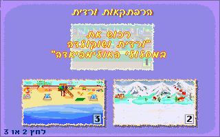 The core appeal of Vardit BeHarpatka Hadasha BeAlifut HaGlisha lies in its dual mini-game structure, delivered on a single floppy disk. The first segment sends Vardit the cow hurtling down a snowy ski slope, weaving between snowmen, darting past waddling penguins, and hurdling over icy chasms. Each run challenges players to gather a target number of chocolate packets—which vary depending on Easy, Medium, or Hard—while racing against an ever-ticking clock.