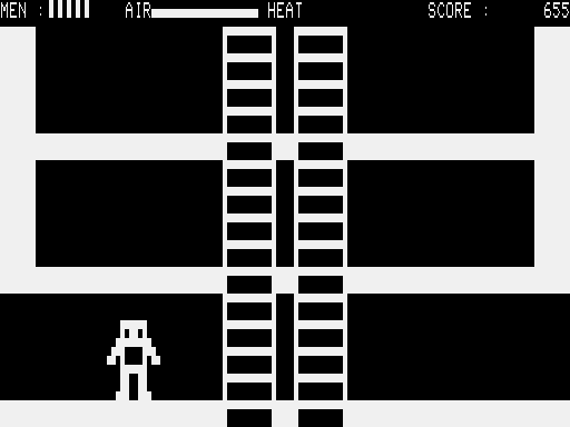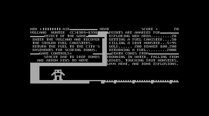Volcano Hunter thrusts players into the volcanic depths as “Hunting Harry,” a lone hero navigating an immense, over-200-screen labyrinth. Your core challenge is to recover stolen fuel tanks pilfered by the ghostly Druts and return them safely to the village. Movement feels tight and deliberate, emphasizing careful ladder climbs, well-timed jumps, and strategic retreats into buildings to avoid the ever-pursuing Druts. With only bombs—each sporting its own timed fuse—to temporarily dispel these apparitions, tension remains high as you juggle exploration with self-preservation.