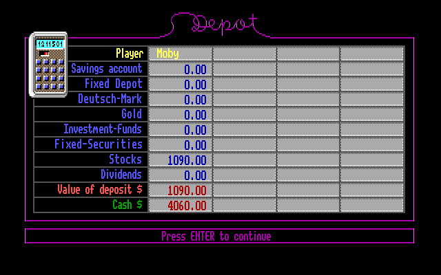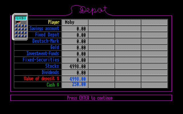 In the depot management program, charts become even more detailed, offering historical data overlays, customizable time frames, and interactive tooltips. While not flashy by entertainment industry standards, Wall$treet’s graphical fidelity does precisely what’s needed: communicate complex financial data in an accessible, aesthetically pleasing package.