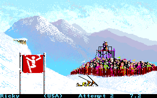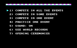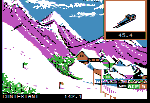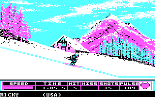 By today’s standards, Winter Games’ pixel-art visuals are charmingly retro, but at the time of its release they represented cutting-edge home-computer graphics. Each event is laid out on a single static screen, with carefully animated sprites that convey speed and momentum effectively. The Bobsled course, for example, features smooth scrolling that makes every sharp turn feel dynamic and intense.