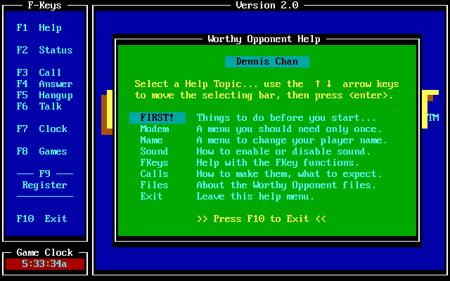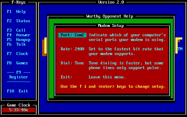 Connections are handled via direct computer-to-computer modem links, harking back to an era when “multiplayer” meant picking up the phone and dialing your opponent. Worthy Opponent’s internal terminal software keeps latency to a minimum and even supports live chat and taunting during gameplay, ensuring each match feels social and tense. On a 2400-baud or even 1200-baud connection, response times remain brisk, thanks to its ANSI text-mode graphics and efficient protocol, so you can focus on outthinking your rival rather than waiting for screens to redraw.