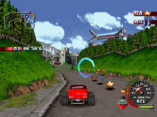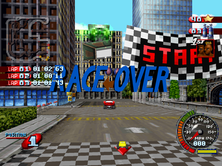 Races are framed as carnival-style events, complete with overzealous announcers, gaudy banners, and a crowd that cheers or jeers based on your performance. Mid-race commentary occasionally updates you on secret pickups or calls out when someone dashes through a hidden teleport, adding a living, reactive feel to each heat.