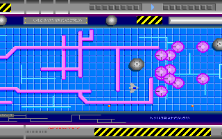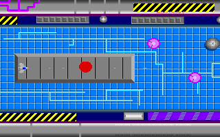 The color palette shifts drastically between the two levels, moving from cold, metallic blues in the docking bays to ominous reds and purples deep within the alien core. This contrast not only keeps the environments visually distinct but also signals escalating danger. Character design is minimal—your ship is a simple but sharp silhouette—yet it stands out crisply against the often busy backgrounds, ensuring that gameplay always remains clear.