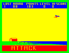 Visually, Jump Jet embraces the charm of early home-computer titles with crisp, minimalist sprites rendered in a limited but effective color palette. The Harrier is instantly recognizable, and enemy aircraft are distinct enough to be identified at a glance. While there’s no sleeking shading or high-resolution textures here, the game’s pixel art exudes nostalgic appeal and serves its purpose in fast-paced aerial combat.