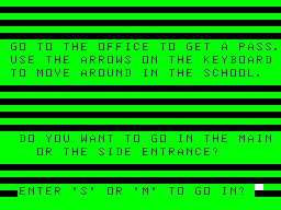 School Maze offers a measured, methodical approach to exploration that will appeal to fans of classic text-and-graphic adventures. Instead of fast-paced action or complex combat systems, the game challenges you to navigate the halls of a sprawling school building by issuing simple directional commands. Your primary objective is to retrieve an important computer tape, but before you can begin your quest in earnest, you must first secure a pass from the school office. This initial task sets the tone for a gameplay experience rooted in careful observation and problem-solving rather than reflex-based challenges.