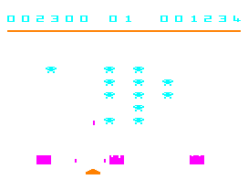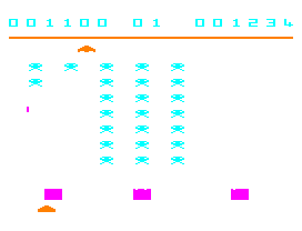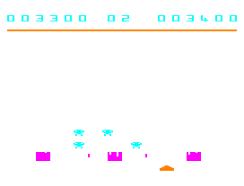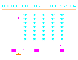 Visually, this version opts for a bold palette on a stark white background: an orange ship, cyan-colored invaders, and magenta barriers. The high-contrast scheme ensures clarity, making it easy to track enemy movements even in hectic moments. The bright colors also give the game a modern, almost neon-like look, distinguishing it from darker arcade cabinets of the era.