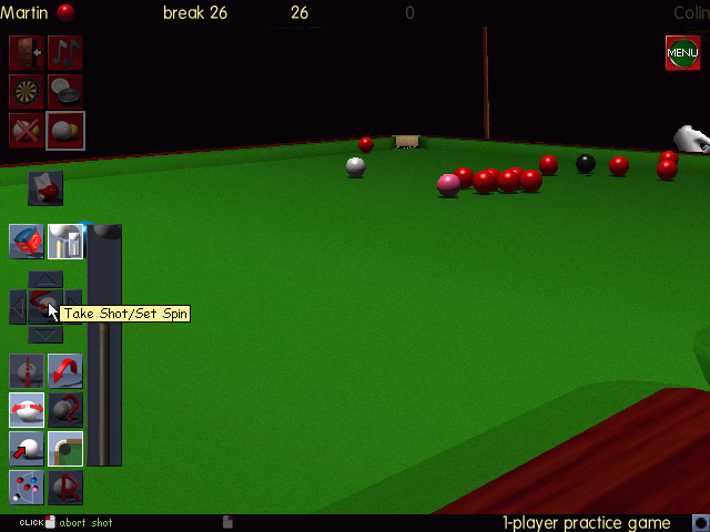 The game’s visuals stand out for their time, boasting well-textured cloths, reflective balls, and polished table rails that catch the light naturally. Realistic shading and subtle ball spin trails help convey the speed and direction of each shot. Tables are set in richly detailed venues, complete with audience balconies and wood-paneled hallways that lend an authentic snooker-club atmosphere.