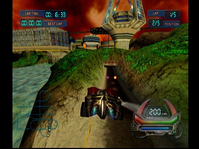 Texture work on the tracks—though low-resolution by modern standards—remains functional, with clear lane markers and distinctive environmental hazards. Reflections and lighting effects, especially at night or in neon-lit sections, add depth to each circuit. For a late-era Dreamcast title, POD SpeedZone represents an impressive technical showcase that remains charmingly retro today.