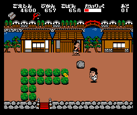 For its era, Karakuri Dōchū presents a colorful and charming depiction of feudal Japan. The character sprites are large and expressive, with Goemon’s signature blue-and-white outfit easily recognizable against the vibrant backgrounds. Enemies range from ragtag bandits to mythical creatures, each rendered with enough detail to stand out in the heat of battle.