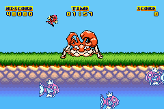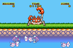 The core mechanic revolves around the A button: a quick tap nets shallow fish, while holding A determines how deep Kingler reaches. Hold it too long, however, and Kingler will accidentally smack his own claw, stunning himself and wasting valuable time. This risk–reward system encourages players to constantly balance greed and caution, especially when higher-value Magikarp appear near the riverbed.