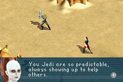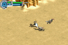 Graphically, The New Droid Army closely resembles its GBA predecessor Jedi Power Battles, boasting crisp sprite work and detailed backgrounds rendered in a muted yet atmospheric color palette. Environments feel lived-in: the metal corridors of the droid factory glint under harsh lighting, while desert vistas stretch out beneath a sweltering sun. Character sprites are well-animated, capturing Anakin’s dynamic lightsaber spins and menacing droid protocols with surprising fidelity on handheld hardware.