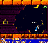 Enemy designs and environmental hazards also benefit from clear, readable art. Spiked pits, crumbling platforms, and rotating saw blades stand out with bright colors and animation cues, giving you a fair chance to react. Boss encounters introduce larger sprites with distinct attack animations, turning these set-piece battles into mini spectacles—remarkable when you consider the Game Boy Color’s technical ceilings.