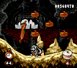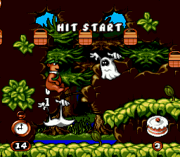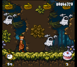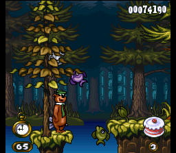 Adventures of Yogi Bear sports bright, cartoon-inspired graphics that perfectly capture the whimsy of the classic Hanna-Barbera series. Backgrounds are richly detailed, featuring lush forests, bubbling streams, and rolling meadows that evoke the spirit of Jellystone Park. Parallax scrolling is used effectively to give a sense of depth, making each area feel more immersive.