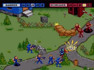 The controls are intuitive yet deepen the tactical experience. Pressing A fires at the nearest foe, B moves your selected soldier to a cursor location, and C cycles through your squad. Commandos mode swaps to direct character control, letting you navigate with the directional pad while calling in your partner with B. Distance, angle of attack, and weapon arcs all factor into your success, so learning each soldier’s strengths—whether the long-range precision of the Launcher or the blast radius of the Blaster—becomes crucial for dominating the front lines.