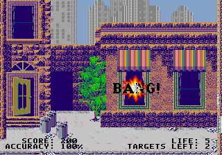 Graphically, the Menacer 6-Game Cartridge leans into bold, high-contrast sprites that stand out under the arcade-style spotlight. Pest Control’s roving insects are simple but clearly defined, and the color changes in Whack Ball’s blocks help you immediately recognize special effects. Across all six titles, the low resolution of the era is used to good effect—elements are large enough to hit, and flicker is minimal even when multiple targets appear.