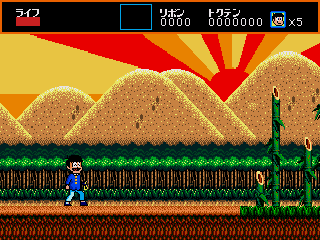 Osomatsu-kun: Hachamecha Gekijō delivers a classic side-scrolling action platformer experience, echoing the straightforward yet charming mechanics of titles like Alex Kidd in the Enchanted Castle. Players take control of Osomatsu, armed with his trusty slingshot, as he traverses bizarre Japanese landscapes filled with oddball enemies ranging from floating teapots to mischievous tengu. Each level demands precise jumps, well-timed shots, and an eye out for hidden passages that unlock secret areas or item shops.