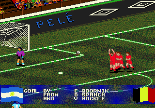 The game’s isometric perspective gives Pelé II: World Tournament Soccer a distinct visual identity. Running from the bottom‐right corner toward the top‐left, the pitch feels expansive, with clearly delineated lines and goal areas. Player sprites are small but well‐animated, showing subtle limb movements on dribbles, tackles, and celebrations. Even on 16‐bit hardware, the stadiums capture the broad sweep of the crowd, and you can almost hear the hum of fans in the background.
