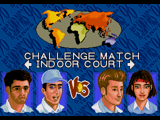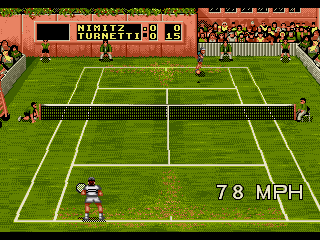 Each court surface is rendered with its own visual identity: Grass courts boast vibrant green hues and faint mowing lines, Clay courts kick up small dust particles on heavy strokes, and Hard courts display reflective sheen under stadium lights. The Indoor court introduces muted tones and sharper shadows, simulating overhead lighting and giving matches a professional, televised feel. While sprite resolution reflects the era’s hardware limits, character proportions and fluidity of movement remain impressive.