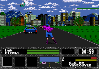 Character animations are surprisingly fluid for a SNES/Mega Drive-era title. Skaters lean convincingly into turns, wobble when hit, and perform wipeouts with a satisfying cartwheel that sends their skates spinning off-screen. The vehicles you latch onto scroll smoothly beneath you, and the occasional sprite flicker only adds to the feeling of breakneck speed. The simple but expressive enemy designs make it easy to distinguish between a novice skitcher and a homicidal street racer.