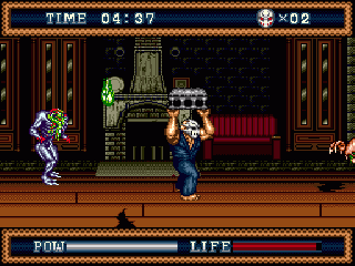 Splatterhouse 3’s graphical presentation marks a significant leap over its 16-bit predecessor. The environments are richer, with detailed backgrounds depicting grotesque corridors, blood-spattered walls, and shadowy alcoves dripping with atmosphere. Each room feels distinct, from the cobweb-laden foyer to the torch-lit hallways, reinforcing the mansion’s sprawling, maze-like terror.