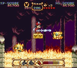 Visually, The Magical Quest Starring Mickey Mouse is a showcase of the SNES’s colorful palette and Mode 7 prowess. Backgrounds shimmer with multi-layered parallax scrolling, giving depth to enchanted forests, snowy mountaintops, and the ominous halls of Pete’s castle. Each environment radiates Disney’s signature charm, as if you’ve stepped into a living cartoon cell.