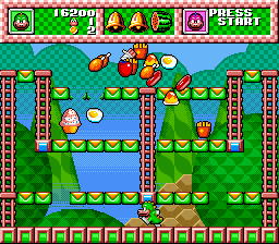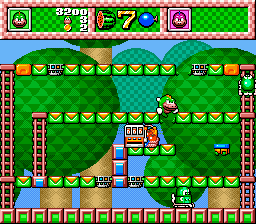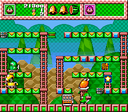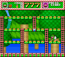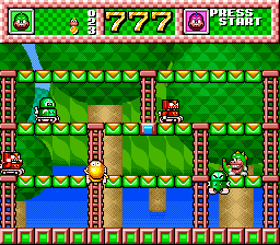 At its core, Wani Wani World embraces a time-honored formula of platform-puzzle action inherited from classics like Space Panic and The Berlin Wall. Rather than offering a run-and-gun experience, the game focuses on precise timing and spatial planning. Players control Charlie and Smiley, two hammer-wielding dinosaurs, maneuvering them across interconnected ladders and platforms. Enemies patrol each screen, and your only method to dispatch them is to bash a hole in the floor above and wait for them to tumble in before delivering the final blow.