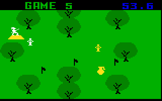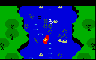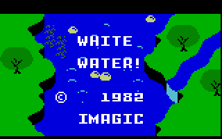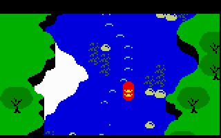 In White Water! your primary objective is to guide a raft down a treacherous river in the fastest time possible. The core mechanics revolve around steering through dangerous turns, avoiding rocks, navigating through whirlpools, and dodging floating barrels. You begin each trip with three men aboard your raft, and a miscalculated turn or collision can send one of them overboard. The tension of trying to keep all three afloat while maintaining top speed keeps each run exciting and unpredictable.