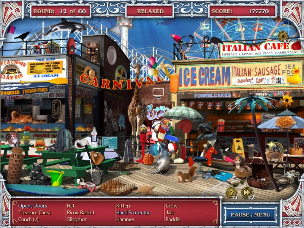 The hint system adds strategic depth to the hunt. Scattered coins across the background scenes are stashed in your bottom-right corner, waiting to be spent. “?” coins point out a single object, “►►” coins briefly highlight several targets, and clock-shaped time coins extend your countdown. Beyond that, score coins boost your end-of-level tally, while skip coins let you bypass mini-games that pop up between each scene. Deciding when to spend or save these resources transforms the gameplay from simple clicking into a light resource-management puzzle.