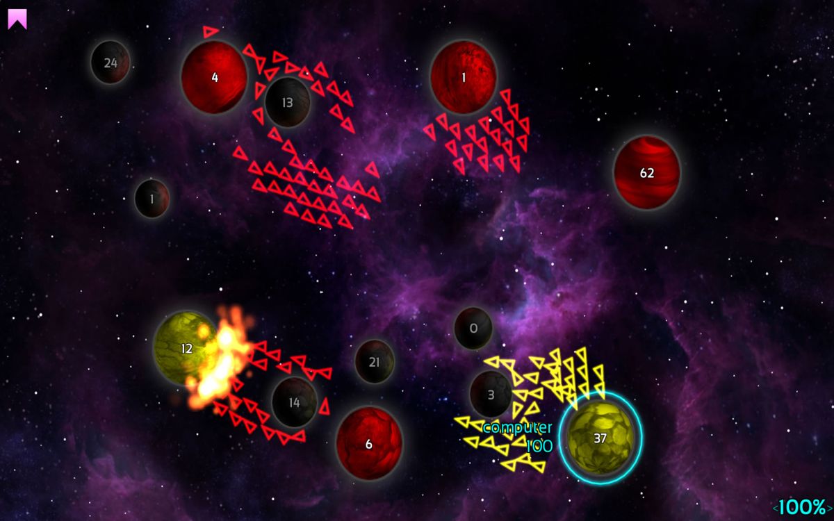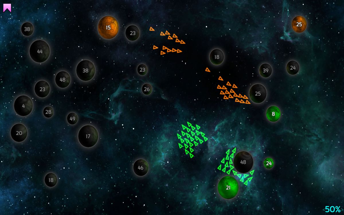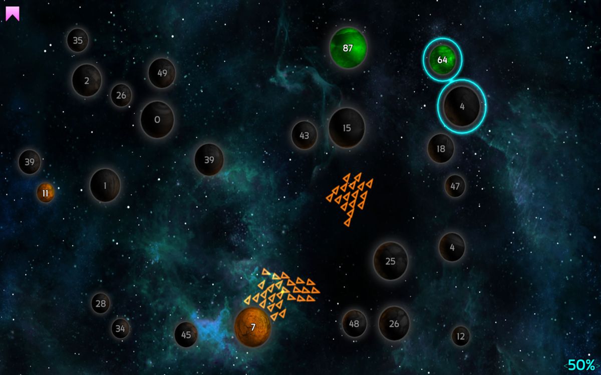 Visually, Galcon Fusion takes the clean, vector-based look of the original and elevates it with polished planet textures, smooth animations, and dynamic particle effects for explosions and fleet movements. Planets glow softly, fleets trail streams of light, and the background starfield gently scrolls to give a sense of drifting through space. The overall aesthetic is minimalist yet striking, ensuring that the action remains clear and uncluttered even when multiple fleets cross paths.
